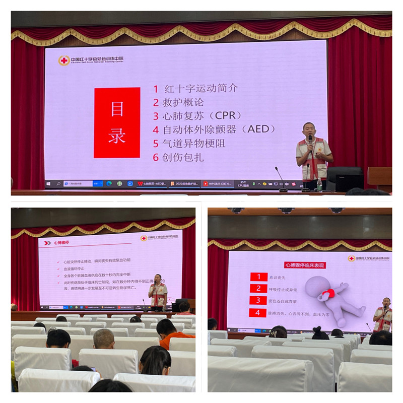 本次活动由黎才武培训师主讲,他围绕红十字运动知识、救护概论、心肺复苏(CPR)、自动体外除颤器(AED)、创伤包扎、气道异物梗阻、常见急症等相关理论知识,结合幽默风趣的语言深入浅出地进行讲解,深深地吸引了在场的每一位学员。