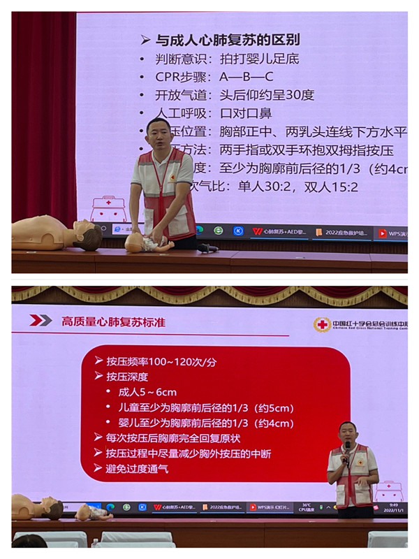 在活动现场,培训师讲授心肺复苏基础理论和操作方法,分别示范儿童和成人心肺复苏的程序和操作技术。