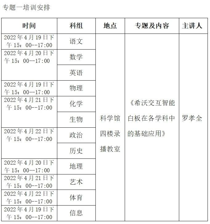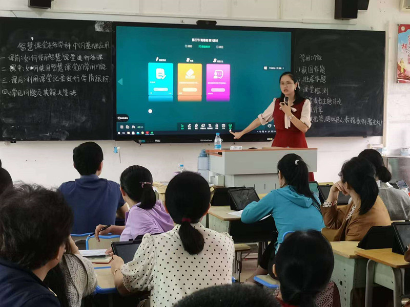 发表时间:2022-06-17 09:40 为了贯彻落实琼海市教育系统“能力提升建设年”活动工作部署和要求,聚焦教师能力建设,发挥信息化技术在学校教育教学中的作用,促进信息技术与教育的全面融合,提高教育教学质量和办学水平,2022年4月19日至5月17日,我校结合信息化示范校建设实际,组织全体教师开展了教师信息技术应用能力提升校本培训活动。 本次培训主要以科组为单位进行集中培训,共有两个专题内容,分别是罗孝全老师主讲的《希沃交互智能白板在各学科中的基础应用》和林小萝老师主讲的《智慧课堂在各学科中的基础应用》。