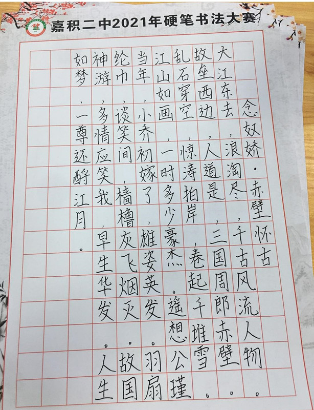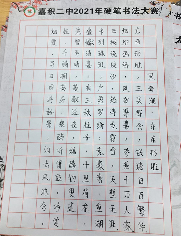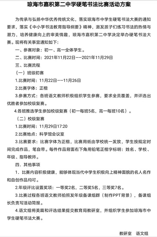 发表时间:2021-12-02 11:40 笔墨传雅韵,挥毫斥方遒。为传承和弘扬中华民族传统文化,发展学生的语文核心素养,培养学生书写的习惯,引导学生规范汉字书写,丰富学生的校园生活,琼海市嘉积第二中学于2021年11月22日-11月29日开展硬笔书法比赛。 在比赛活动开始之前,教研室及校语文组就制定了硬笔书法比赛活动方案,提前准备好比赛相关用品,每一位老师都在为本次比赛尽心尽力。