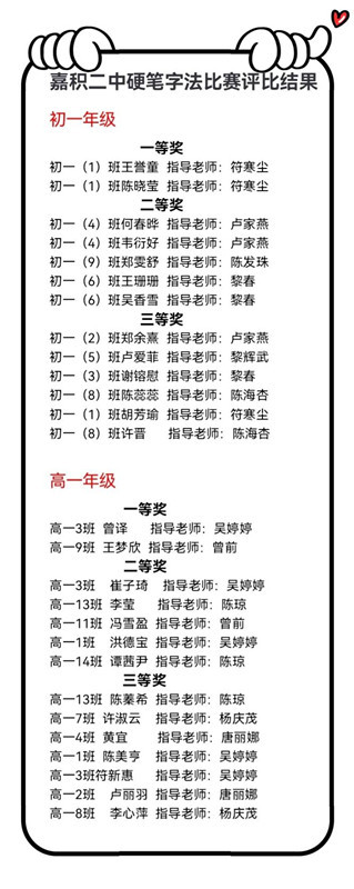 书法学习有秘方:“贵在坚持,方能收获”,通过这次比赛,提高同学们规范书写的意识,培养同学们热爱汉字、传承书法文化的品质,形成良好的校园文化。“用笔在心,心正则笔正”,希望同学们在书法中懂得端正姿势,用心写字,踏实做人。同时也希望在学校特色文化建设的引领下,嘉积二中一定会“满校书香味,浓浓笔尖情”。